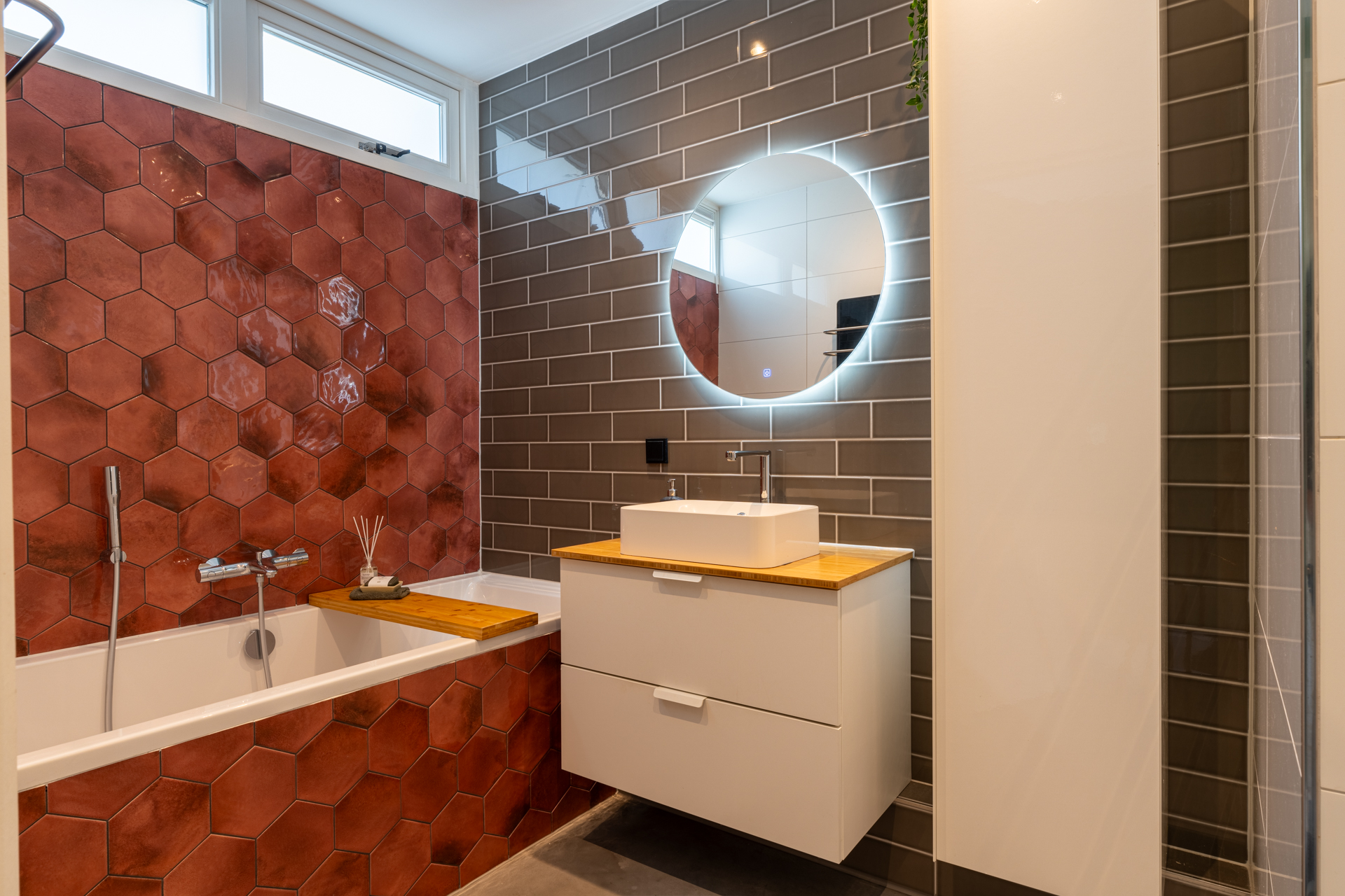 Bij deze badkamer is middels een kleine uitbouw ruimte voor een ligbad gecreëerd.